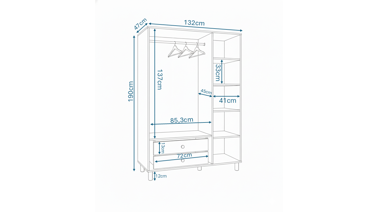 Dolabımız, 1 adet askılık ve 5 adet raf alanı ve 2 adet çekmecesiyle ihtiyaçlarınızı karşılayabilecek ölçülerdedir.