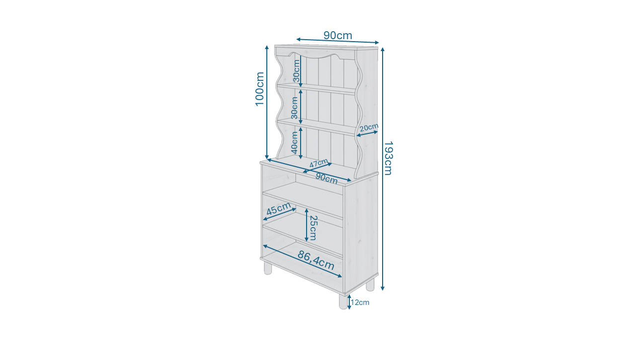 Üst modülün üst rafının yükekliği 35cm, orta rafının yüksekliği 29cm ve alt rafının yüksekliği 30cmdir.