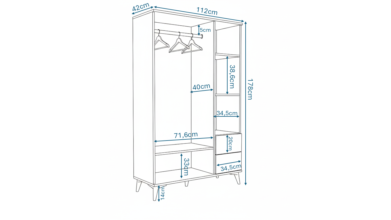 Dolabımız, 178cm Yüksekliğinde 112cm Genişliğinde ve 42cm Derinliğindedir.