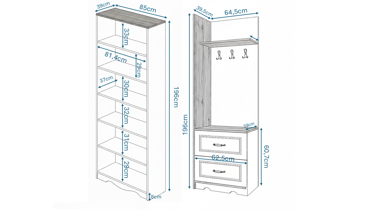 Vestiyer bölümünün yüksekliği 196cm genişliği 65 ve derinliği 39cmdir.