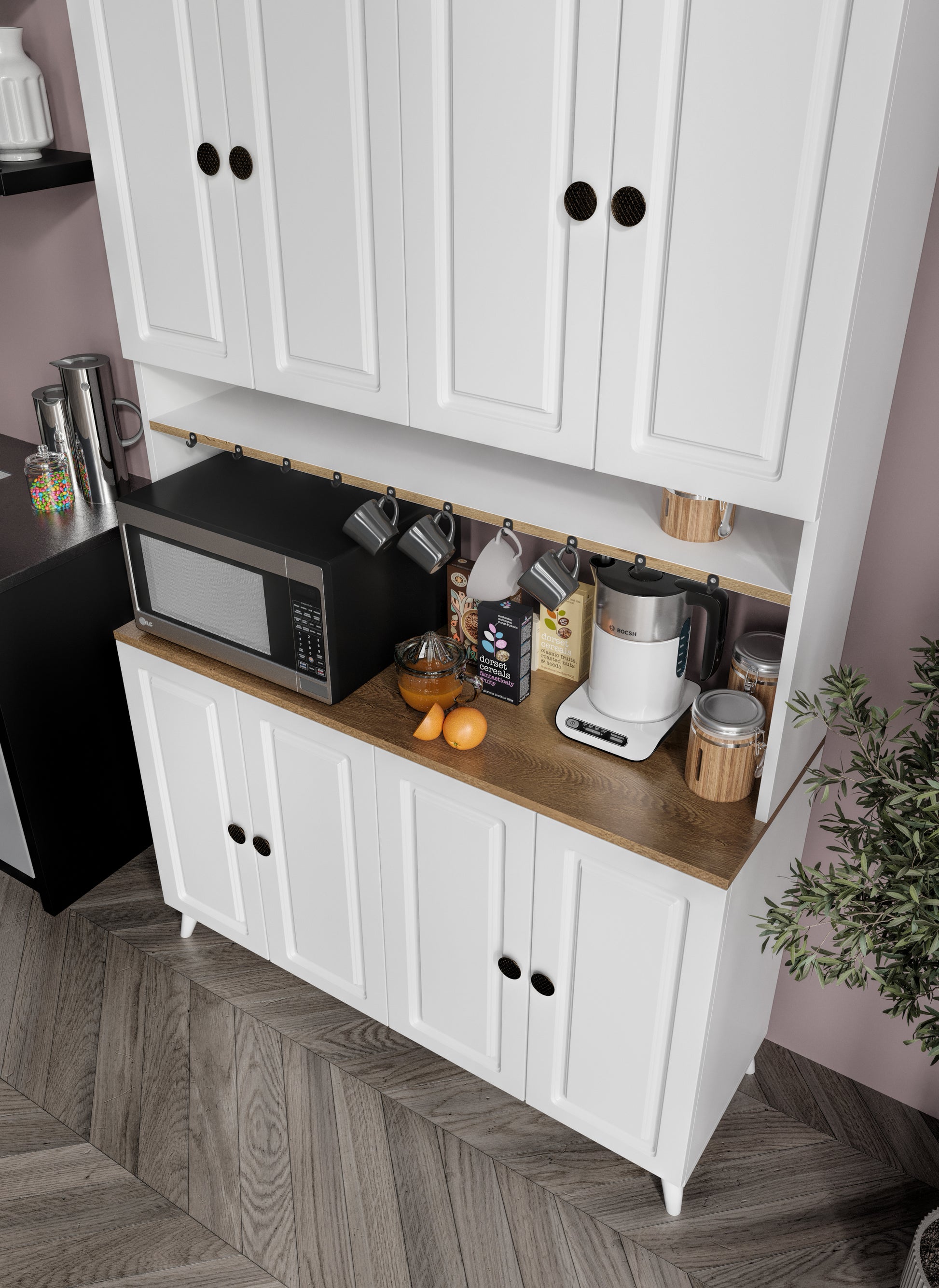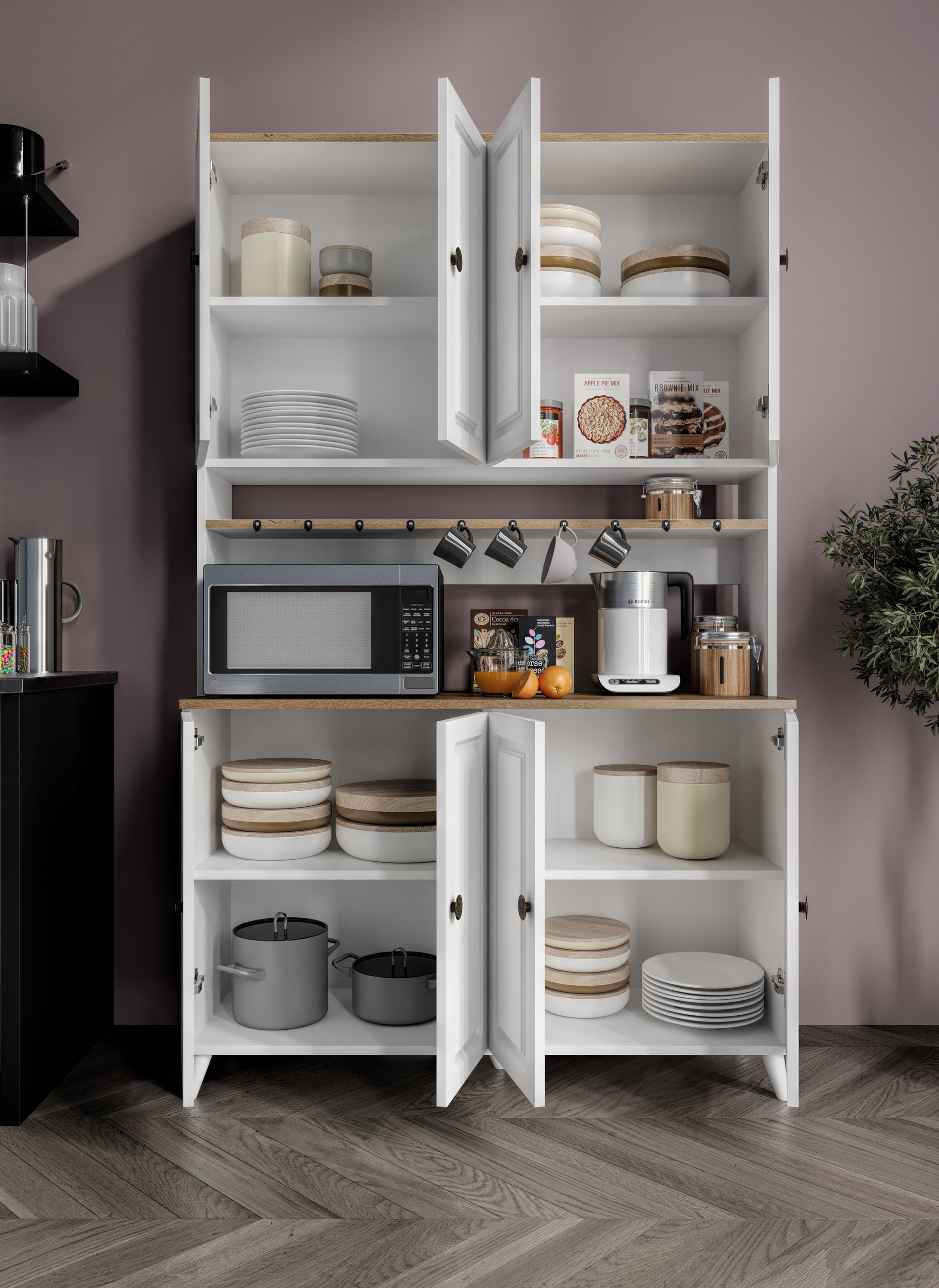 Mikro dalga fırınınızı, airfryer, kavonozlarınızı, tabaklarınızı, mutfak robotunuzu veya kahve makinenizi rahatlıkla bu dolaba yerleştirebilirsiniz.