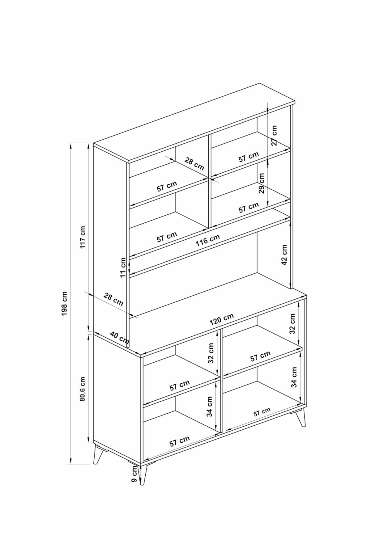 Dolabın yüksekliği 201 cm, genişliği 120cm ve üst taraf derinliği 28cm alt modül derinliği 40cmdir.