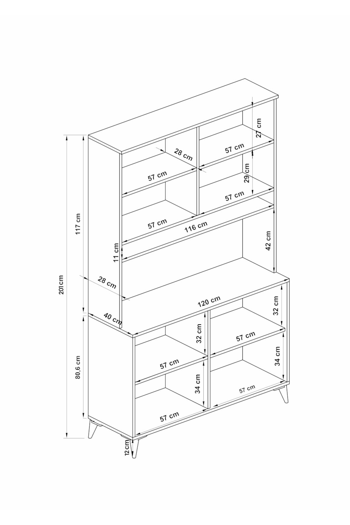 Dolabın yüksekliği 201 cm, genişliği 120cm ve üst taraf derinliği 28cm alt modül derinliği 40cmdir.