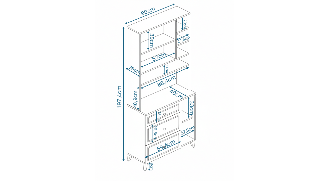 Dolabın yüksekliği 198 cm, genişliği 90cm ve üst taraf derinliği 28cm alt modül derinliği 40cmdir.