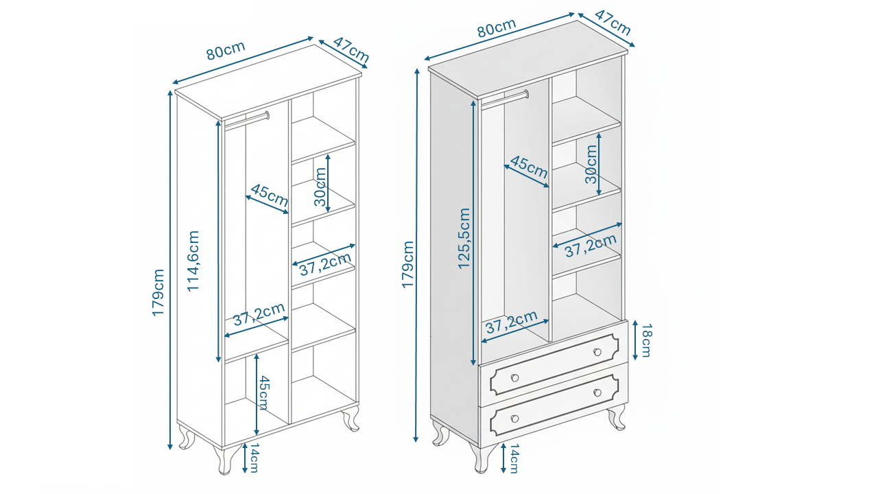 Dolabımız, 1 adet askılık ve 5 adet raf alanı ve 2 çekmecesiyle ihtiyaçlarınızı karşılayabilecek ölçülerdedir.